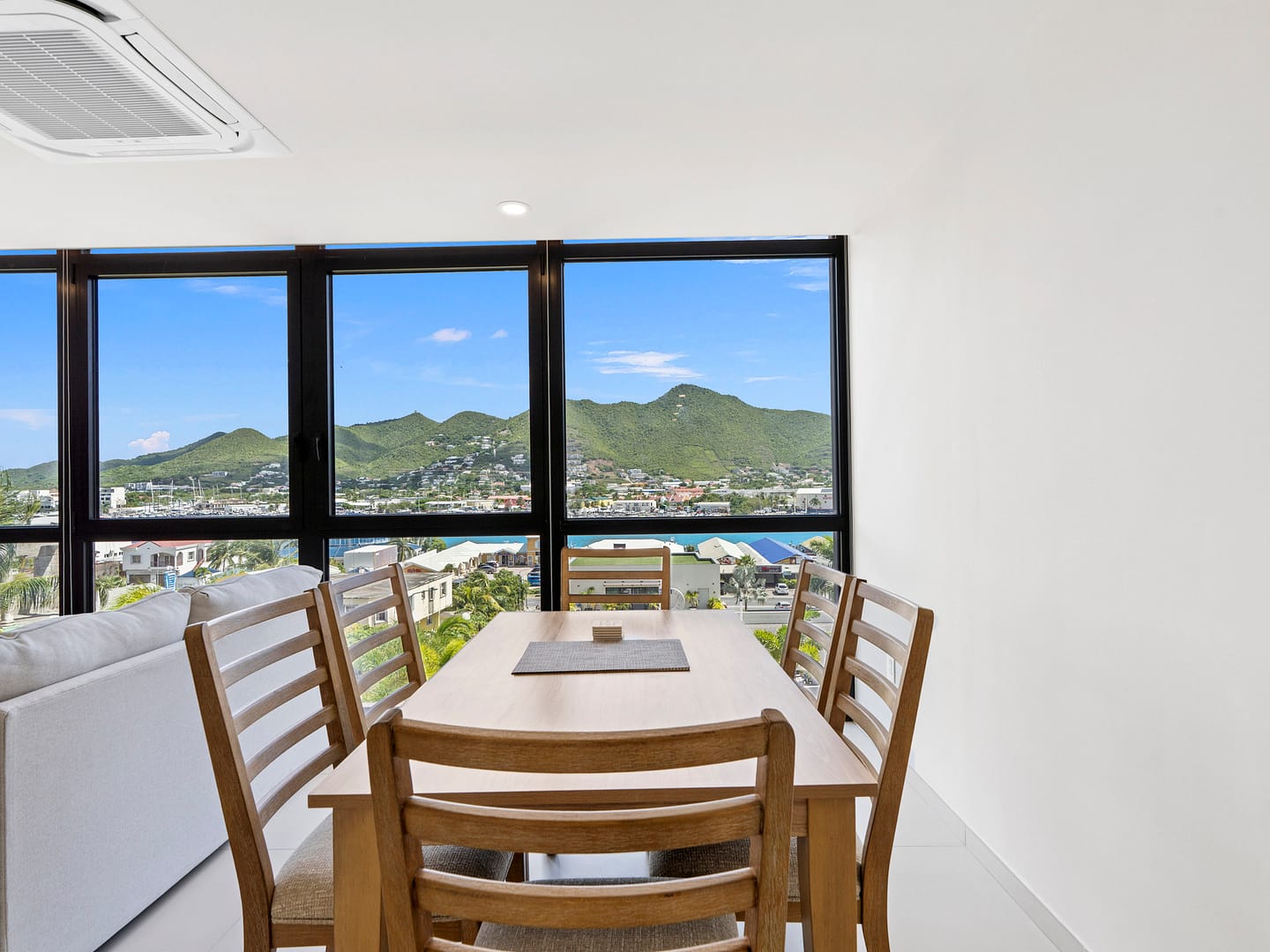 Le salon est spacieux et idéal pour se détendre ou passer du temps avec ses proches. La grande baie vitrée laisse entrer la lumière naturelle et offre une vue magnifique sur le lagon de Simpson Bay. C’est l’endroit idéal pour savourer votre café du matin ou vous détendre après une journée de visites.