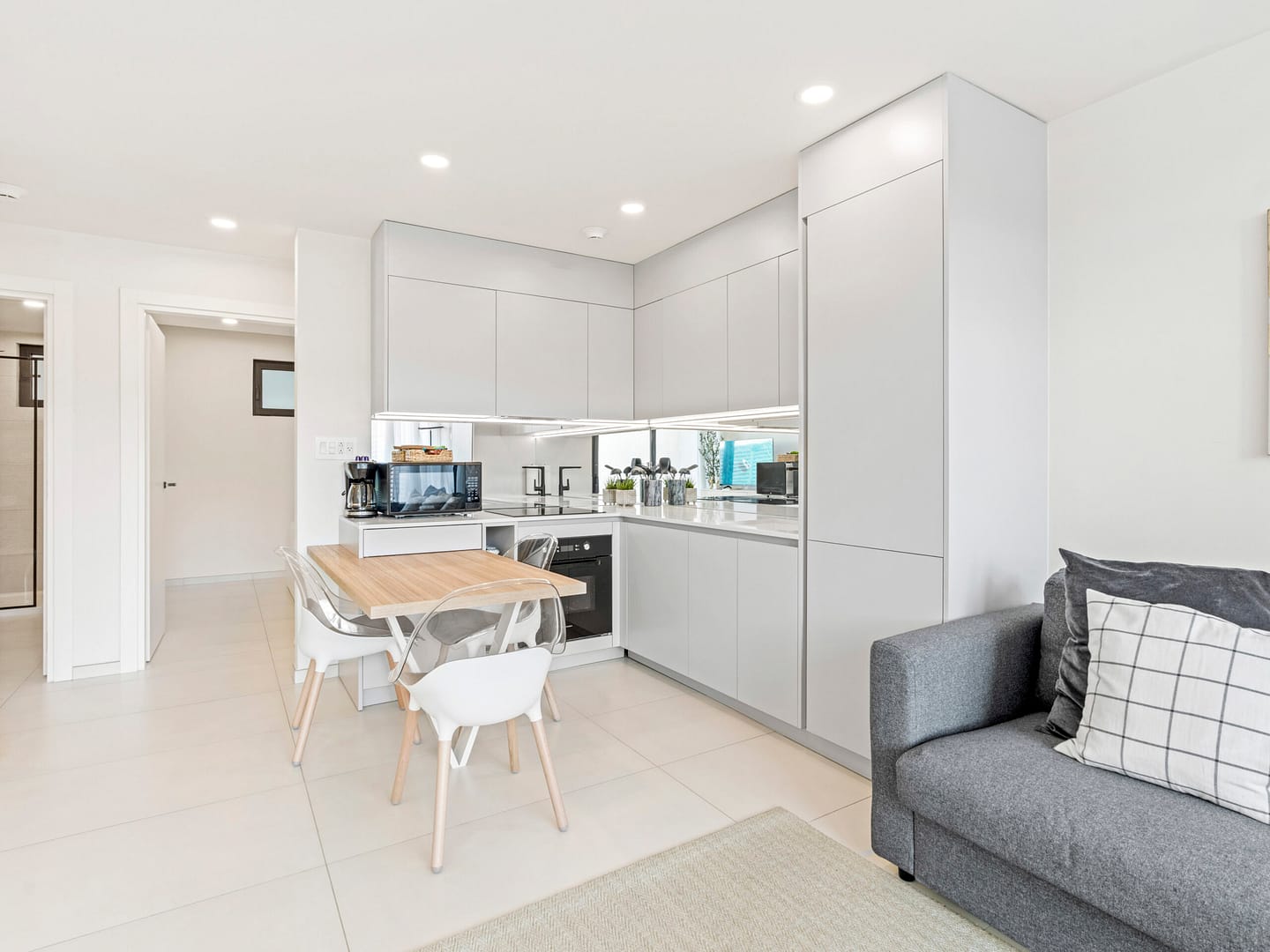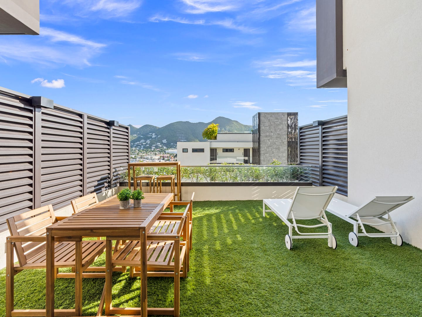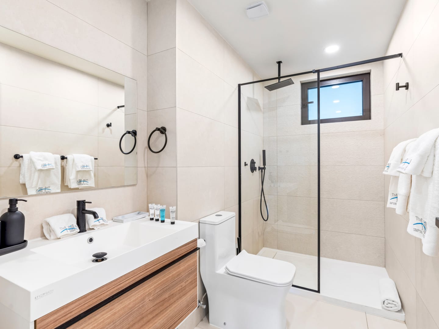 - Terrasse extérieure privée — la plus grande du Bâtiment 2 — imaginez‑vous en train de vous prélasser sur des chaises longues, siroter des cocktails au bar haut ou dîner en plein air, tout en profitant de vues sur la lagune et les collines environnantes.
