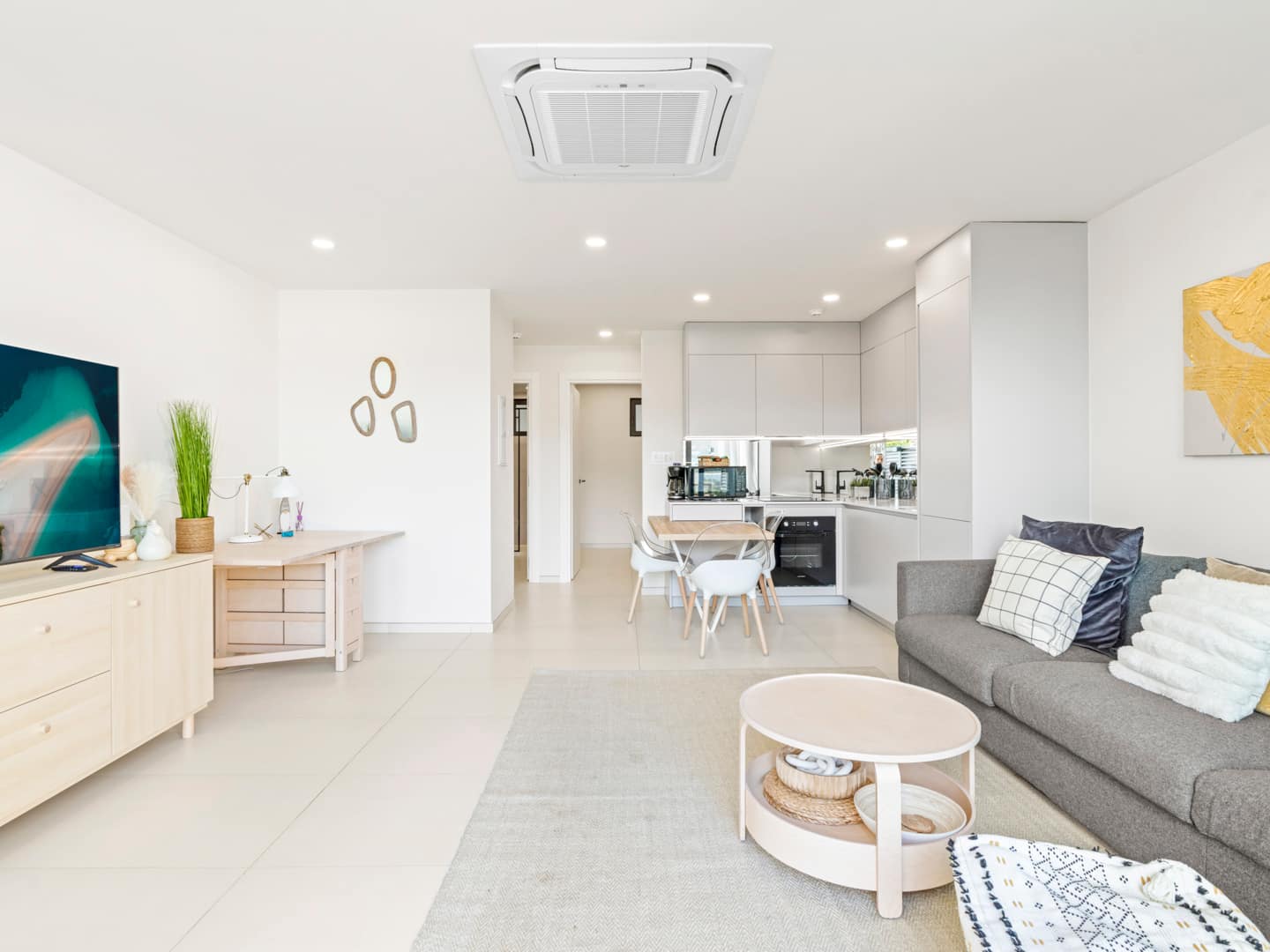 - Salon à aire ouverte baigné de lumière naturelle, où le style contemporain rencontre le confort tropical chaleureux.