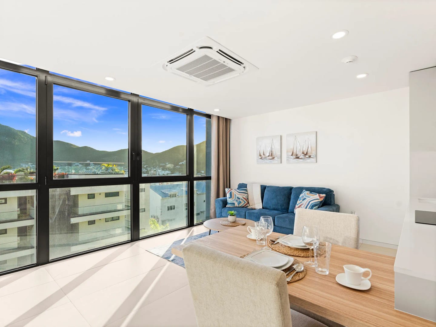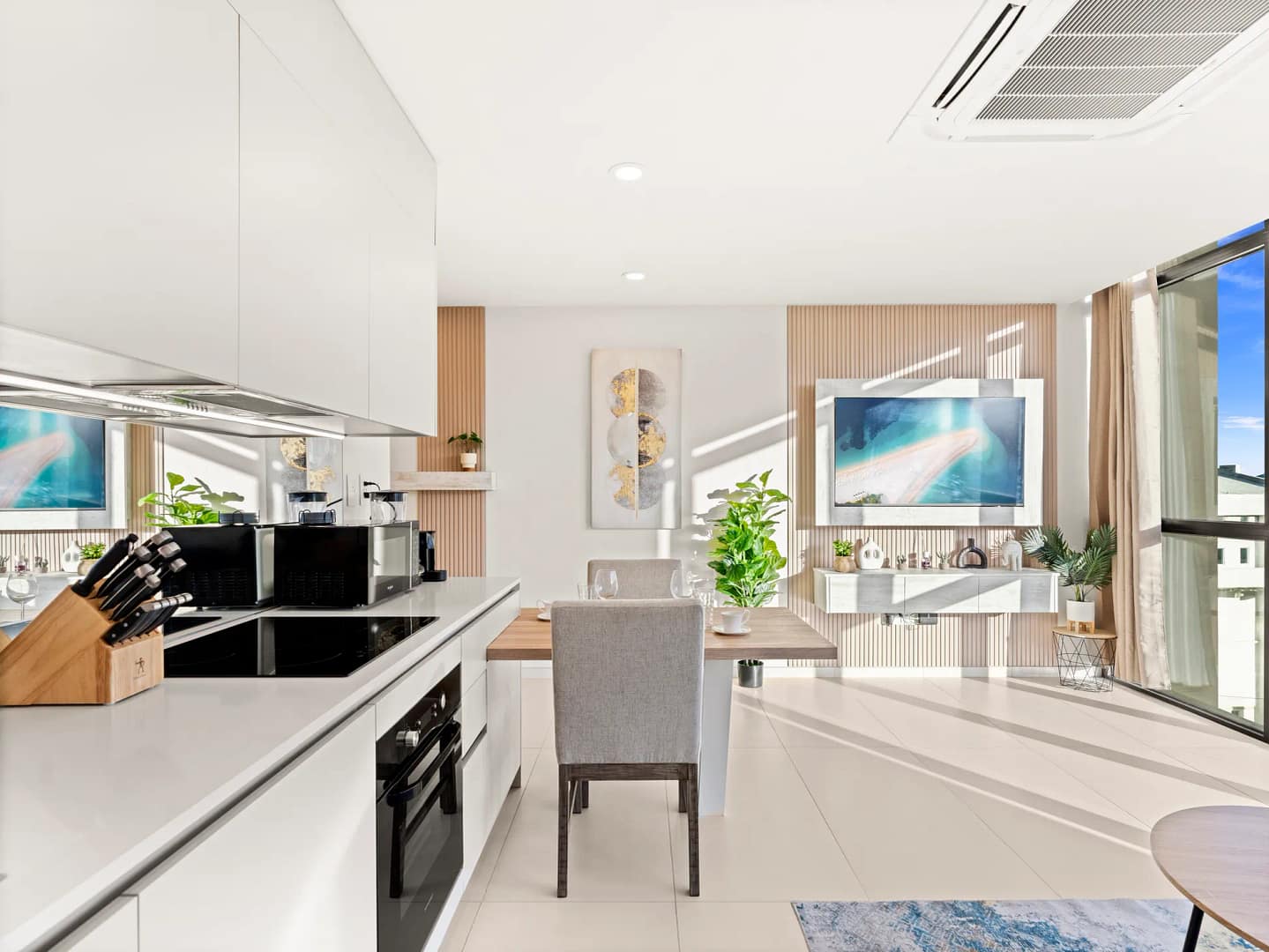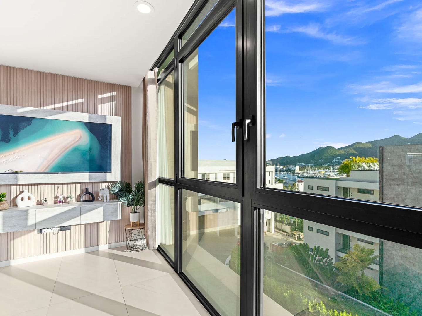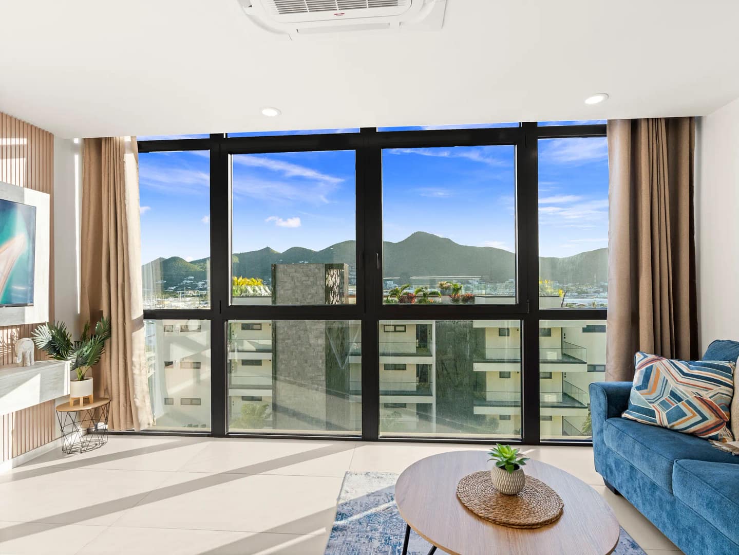 - Salon à aire ouverte, conçu pour mêler élégance moderne et charme chaleureux de l’île.
