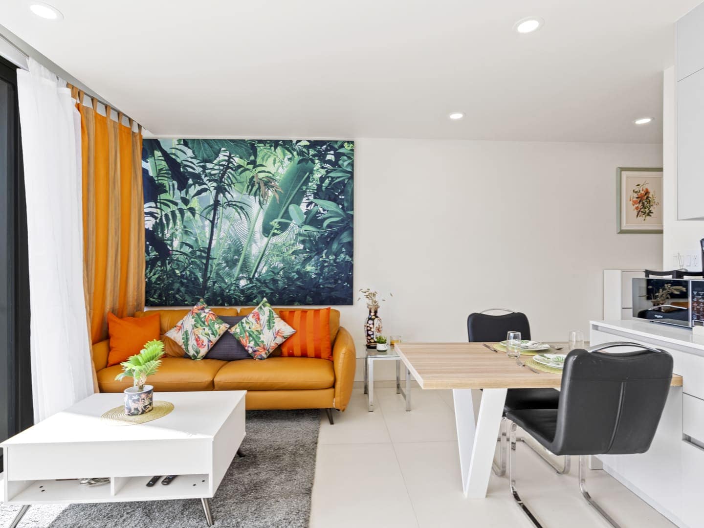 Dès votre arrivée, vous vous sentirez immédiatement chez vous dans le salon à aire ouverte, décoré avec goût et baigné de lumière naturelle. Le coin détente, confortable et chaleureux, est idéal pour se relaxer après une journée d’exploration à Simpson Bay, tandis que la cuisine entièrement équipée vous permet de préparer aussi bien un petit-déjeuner rapide qu’un dîner convivial.