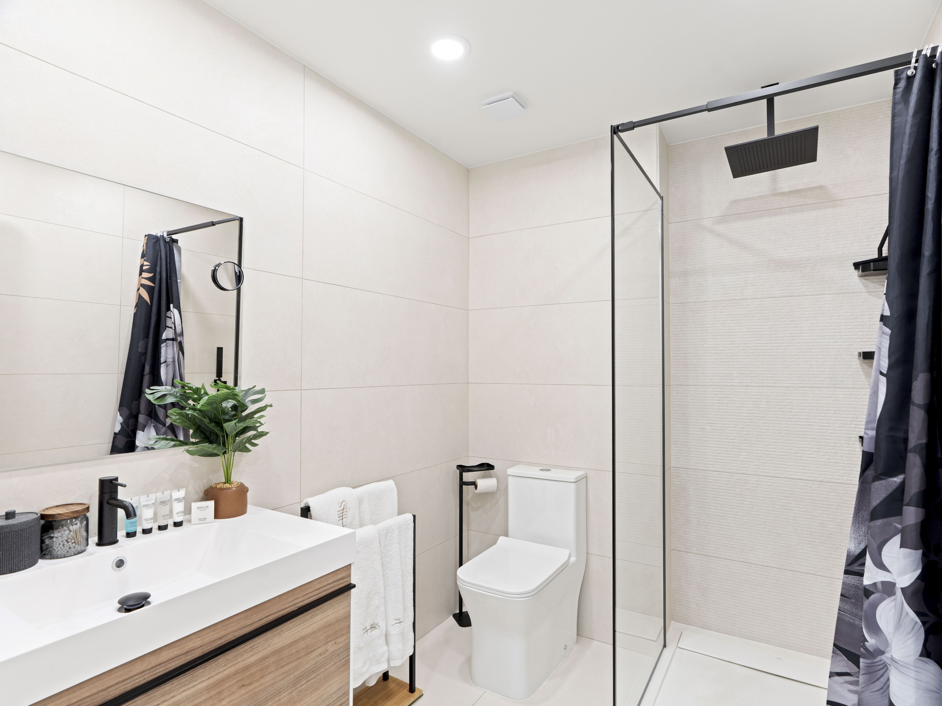 Salle de bain magnifiquement conçue, entièrement équipée avec des installations modernes et une douche à l’italienne