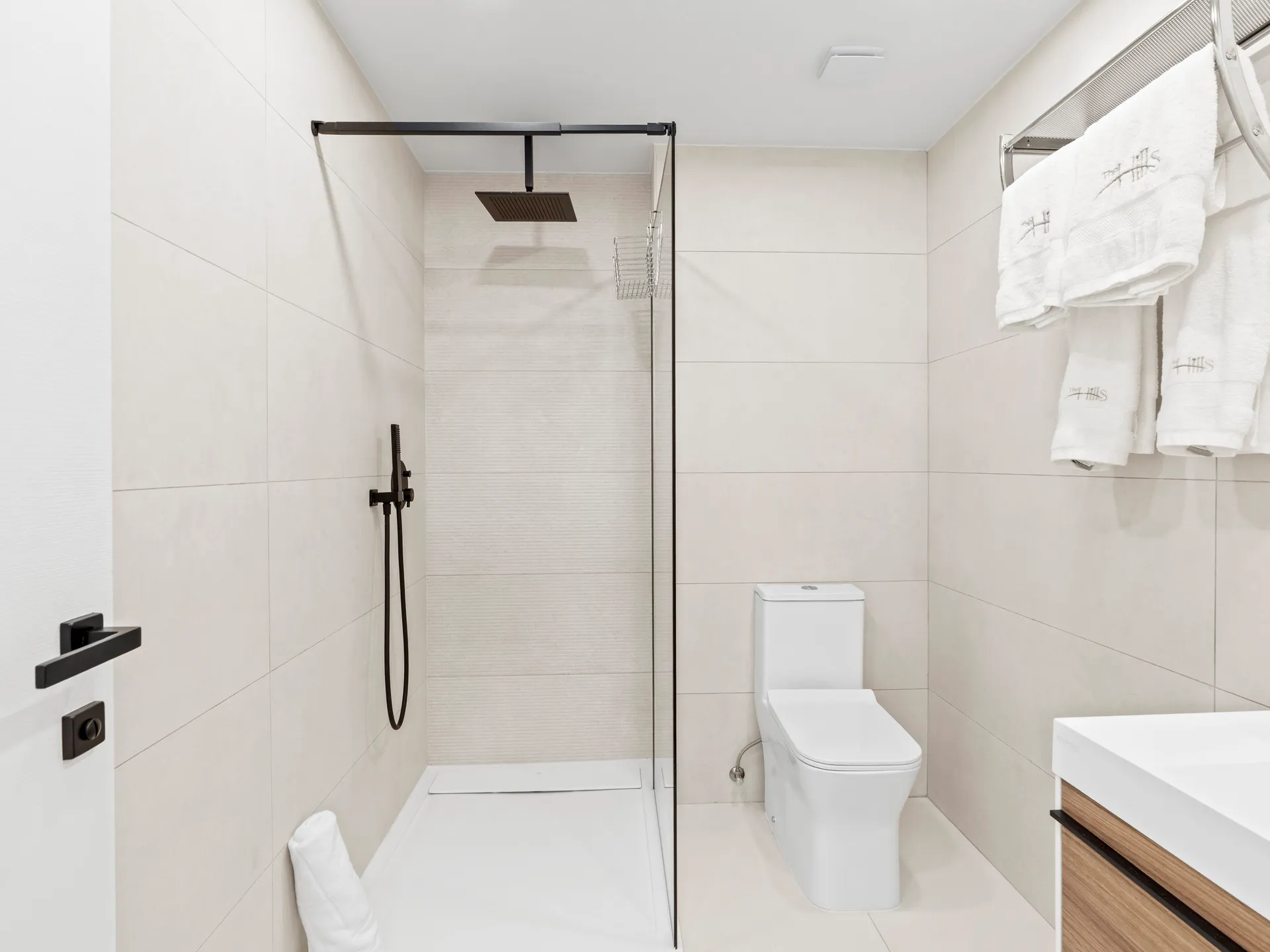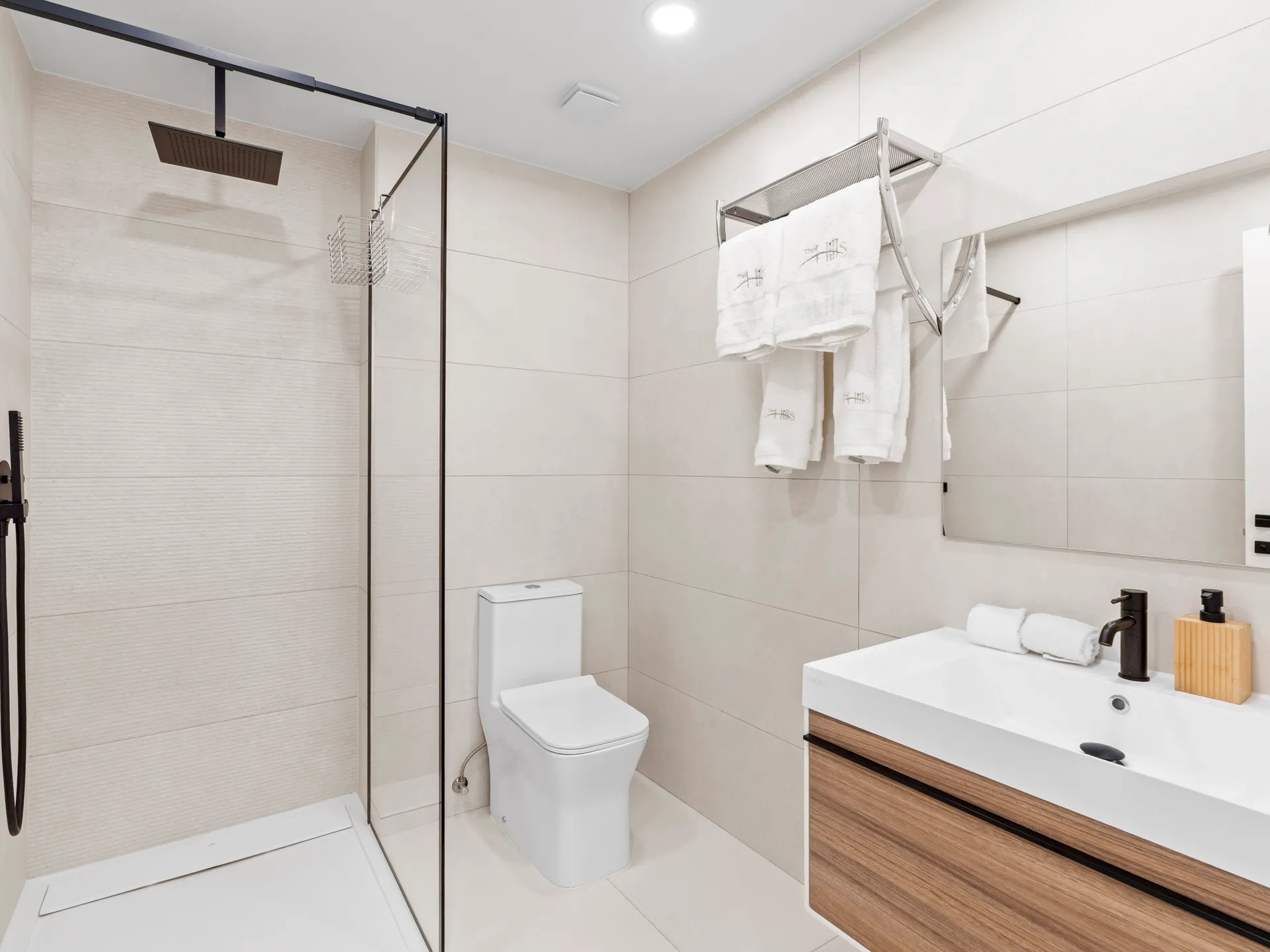 Salle de bain élégante avec une douche à effet pluie dans un style spa.
