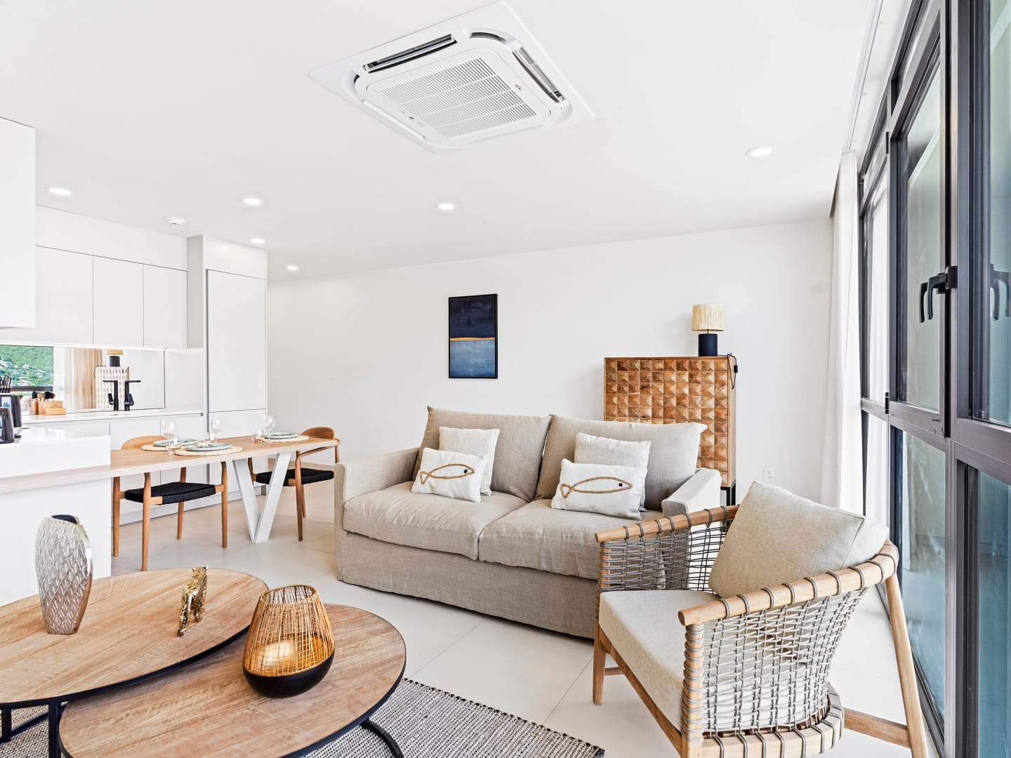 We are delighted to present our stunning two-bedroom apartment, located on the second floor of The Hills residence. With its 75m² of elegant space and its glass wall offering a breathtaking view of the lagoon, this apartment is a real gem.