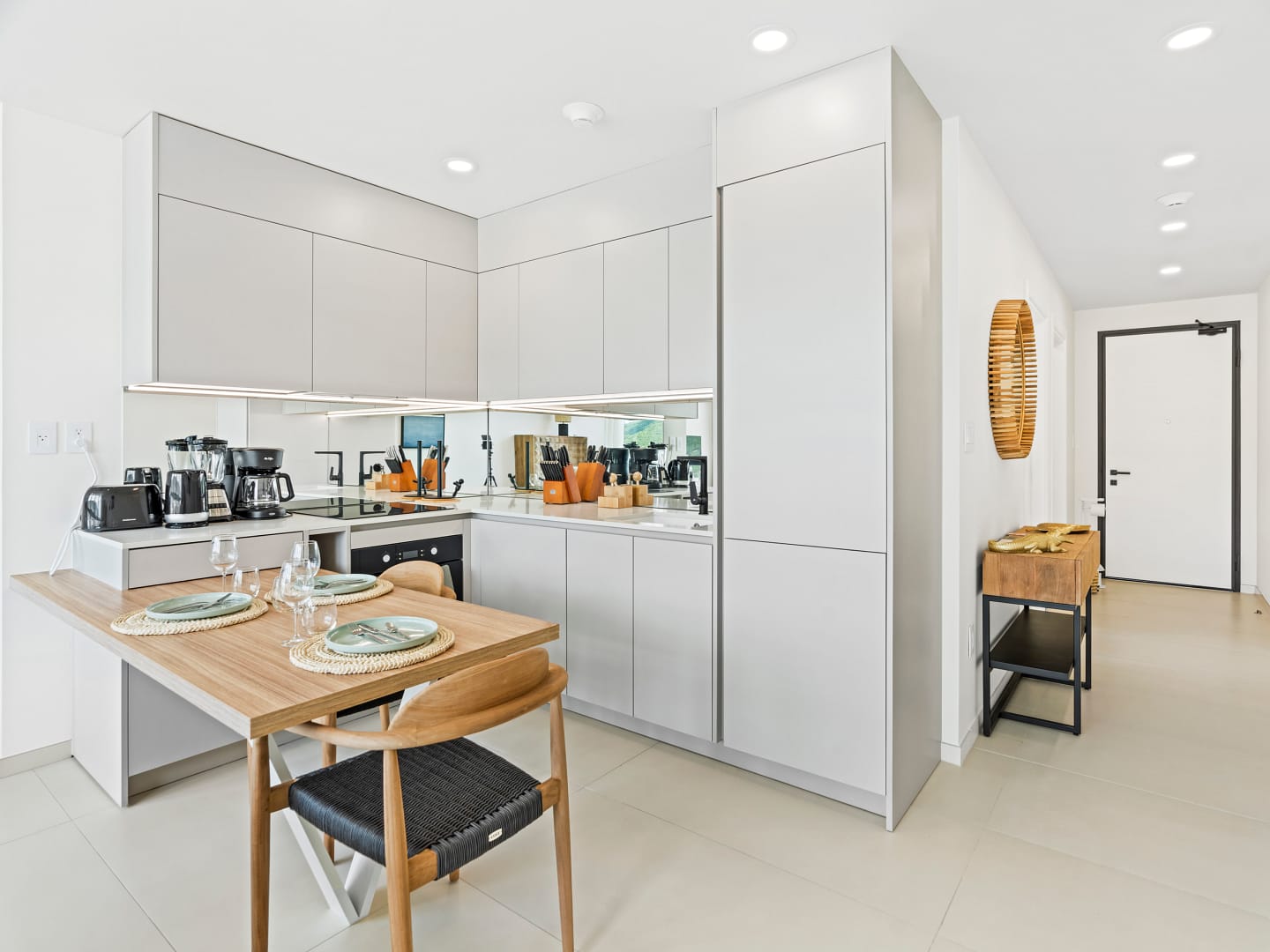 Fully equipped kitchen allowing you to prepare meals while enjoying lagoon views.