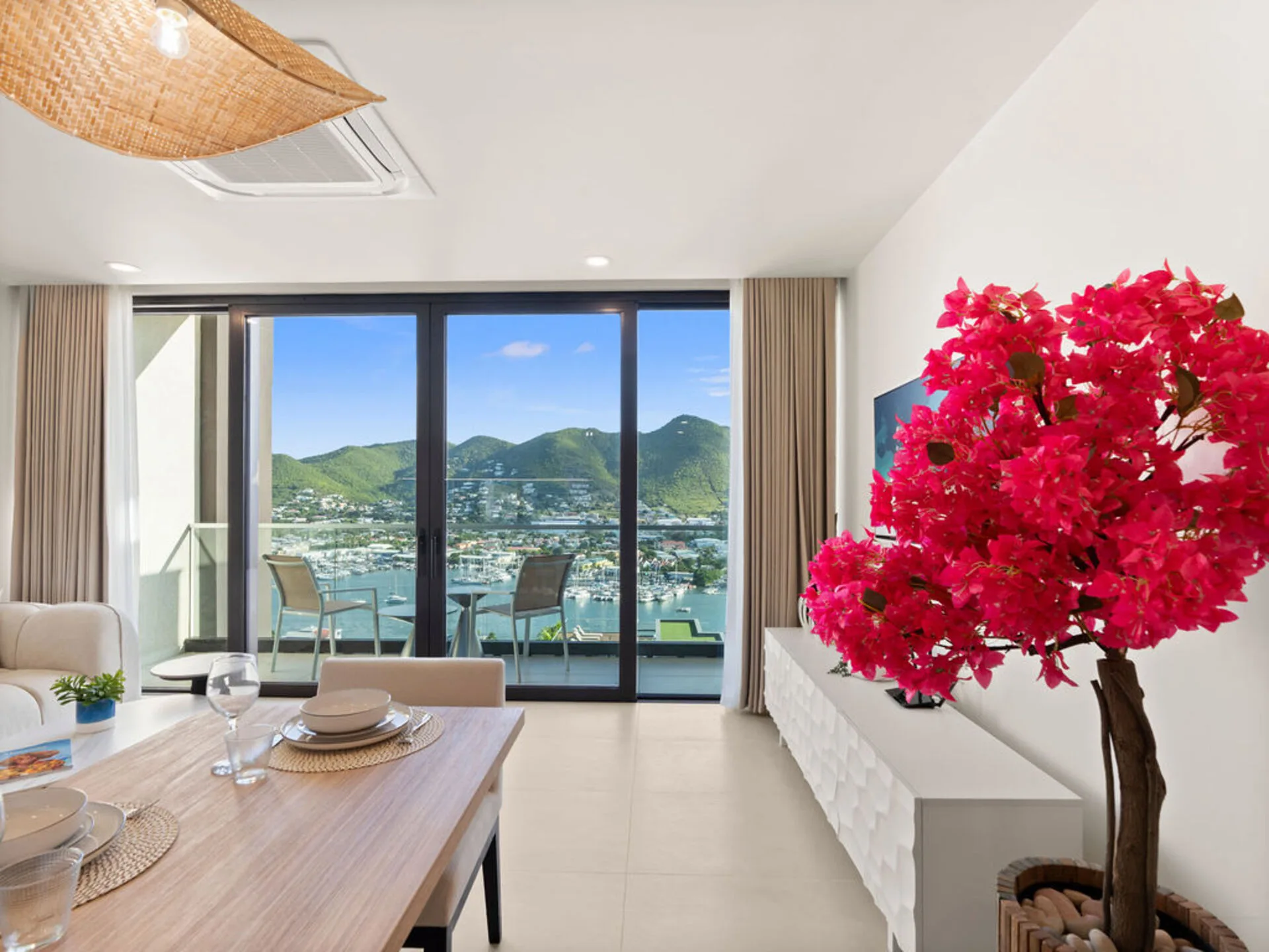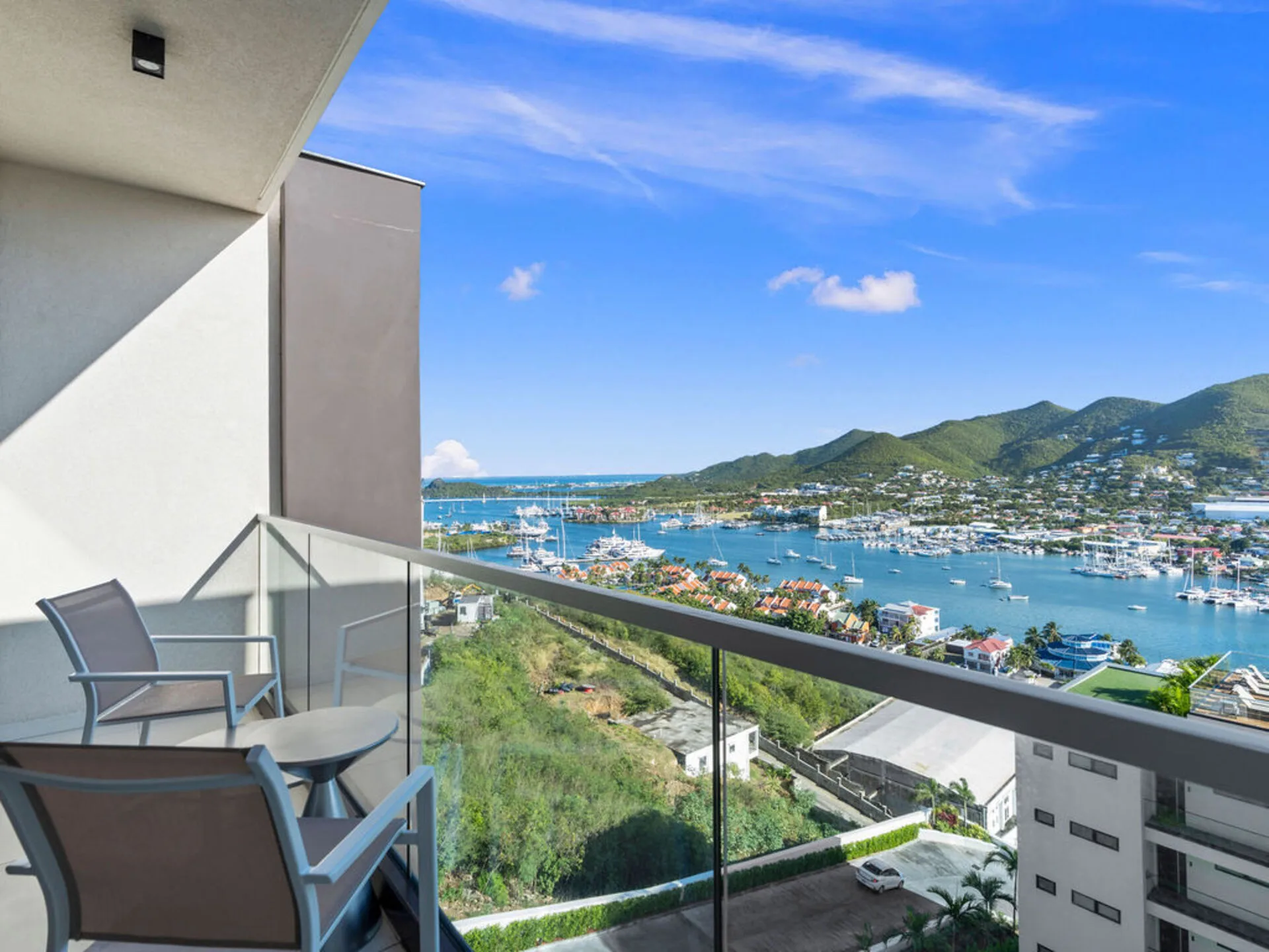 Private balcony accessible from the living area with lagoon views — perfect for relaxing and enjoying the Caribbean breeze